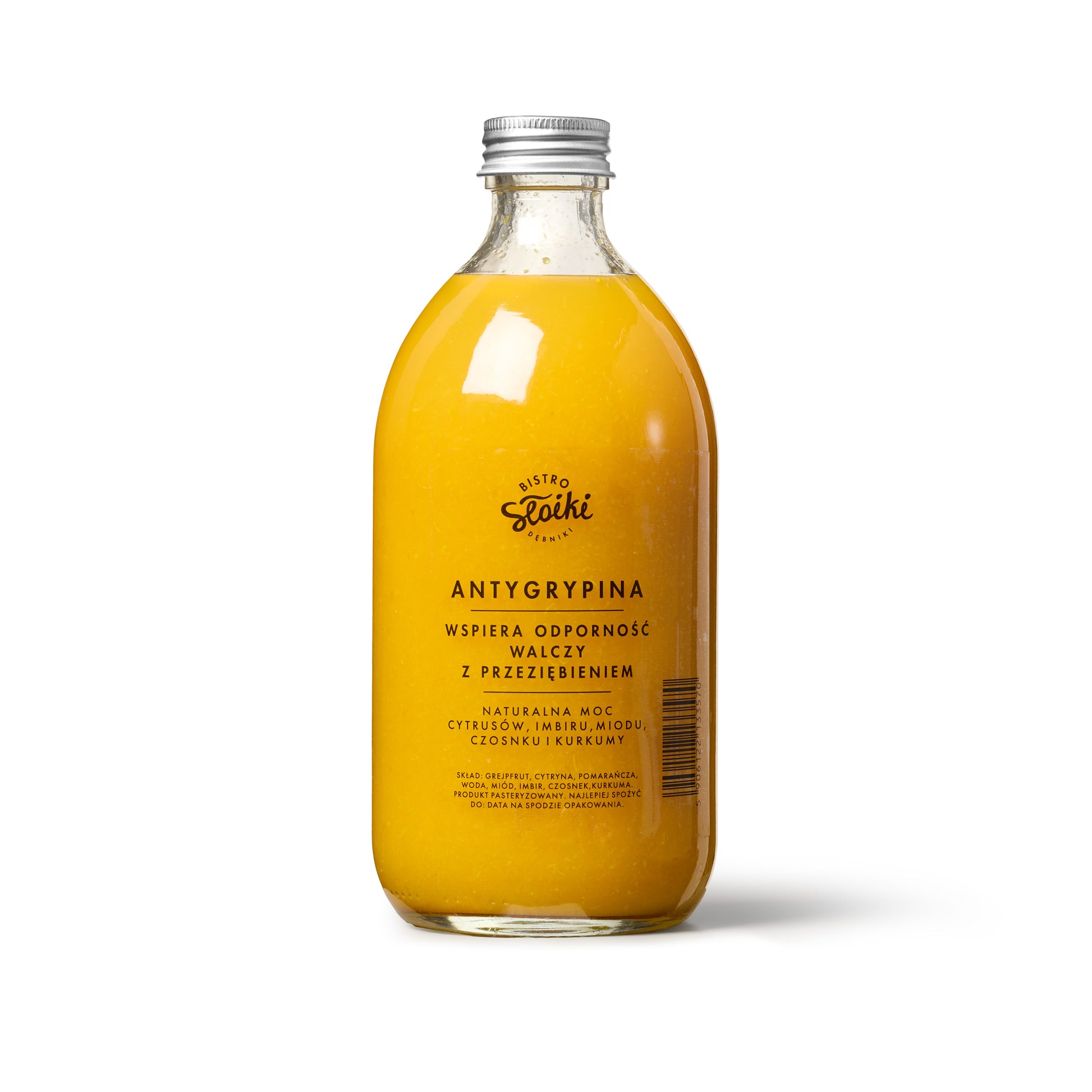Skład: grejpfrut, cytryna, pomarańcza, woda, miód, imbir, czosnek, kurkuma.