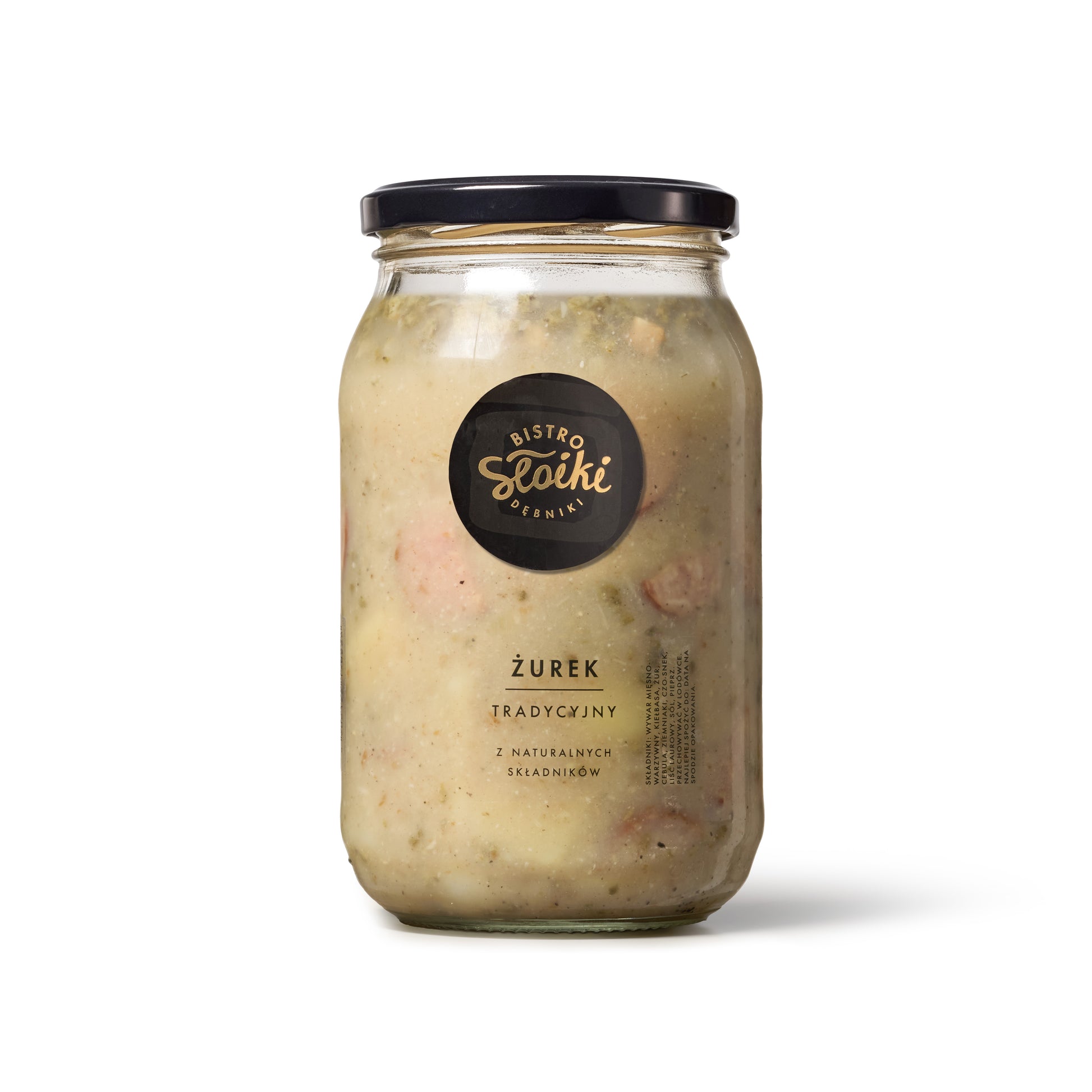 Skład: wywar mięsno-warzywny, kiełbasa, boczek wędzony, żur, cebula, ziemniaki, czosnek, liść laurowy, majeranek, ziele angielskie, sól, pieprz.
